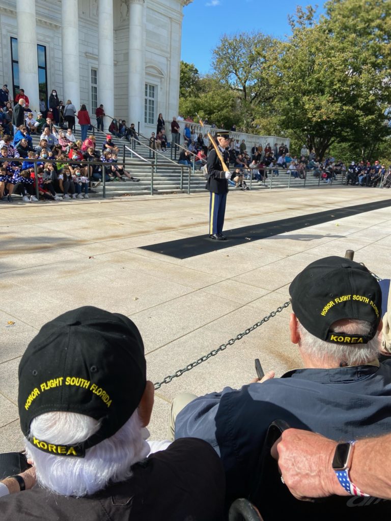 During the Changing of the Guard ceremony at the Tomb of the Unknown Soldier in Arlington National Cemetery, guards are not permitted to stop or acknowledge anyone, but they will make a distinct sound by dragging their boots along the concrete when veterans are present to show their appreciation. “We had a discussion on the bus en route to Arlington, and I told him that when I would hear the scuffing of the boots, that I would put my hand on his back for him to know this was happening. The guard did in fact scuff his boots, and I gently put my hand on his back, and he simply nodded. This was a very moving experience for me and all the veterans there—a highlight for sure.”