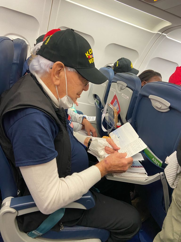 On their return flight home, veterans are presented with large envelopes of letters collected from friends, family, and strangers to show their appreciation. “This is deemed Mail Call, and is a total surprise to the veterans,” Julie said.