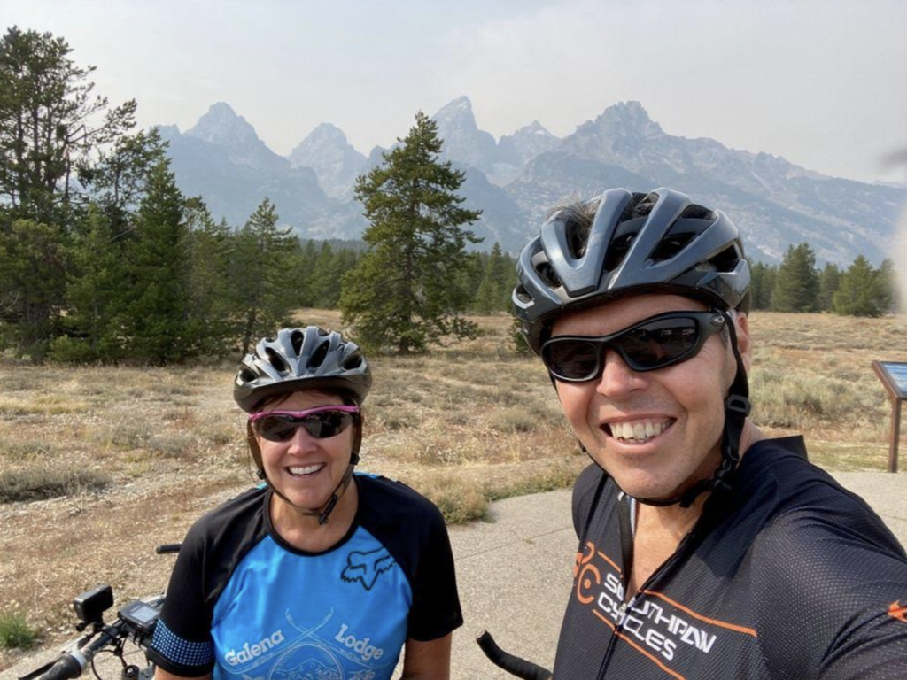 Dr. James Scardo and his wife in Jackson, WY with the Grand Tetons in the background. This was taken during their cross-country bike trip after biking around 50 miles that day.