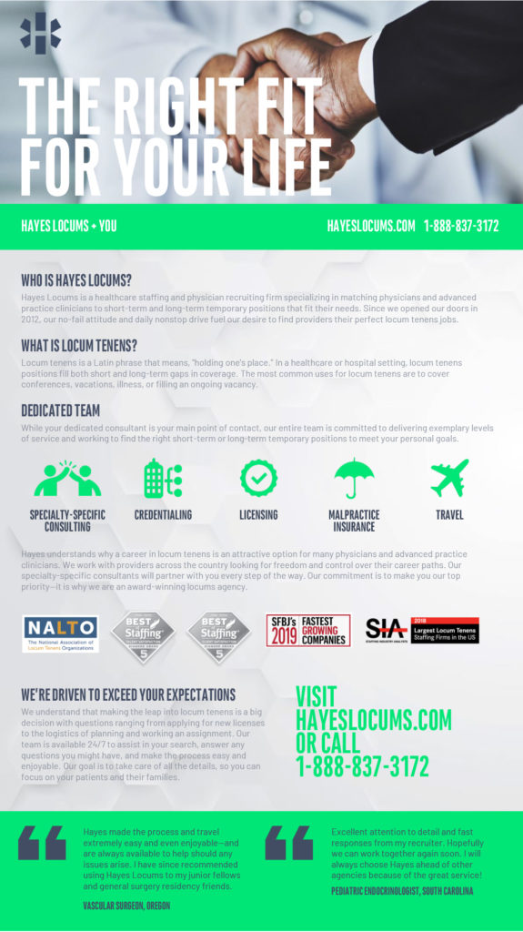 Since opening our doors in 2012, our focus is to find providers their perfect locum tenens job and to fulfill staffing gaps in hospital and healthcare systems nationwide. Hayes Locums is an award-winning healthcare staffing firm and physician recruitment agency focused on providing excellent service to our physicians and advanced practice clinicians on the talent level, and to the hospitals and health system clients we serve.